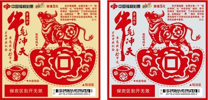 5元“辛丑牛-牛氣沖天”是一款雙聯(lián)彩票。金色銀色與喜慶的紅色搭配,為彩民朋友送上牛年的祝福與喜氣。玩法區(qū)一頭活力十足的牛站在元寶上,中心是古代錢幣配著花紋就像票面名字一樣“牛氣沖天”。中獎號碼區(qū)一個元寶中心寫著“財”,象征著牛年財運亨通。整張票面充滿了中國傳統(tǒng)文化元素,剪紙、書法,全都體現(xiàn)了我國歷史悠久內(nèi)涵豐富的文化,極具收藏價值。