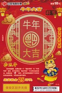 10元“辛丑牛-牛年大吉”彩票采用卡通造型設(shè)計,一只可愛的小牛向你送來牛年祝福“牛年大吉”,可愛活潑;玩法區(qū)整體采用紅色與金色搭配,“中獎號碼”用一個燙金倒“福”字放在整體票面的中央;“我的號碼”像一扇打開的窗戶,左上角還有祥云的圖案,牛年的好運乘著祥云,透過窗戶送到。