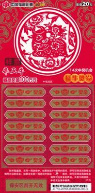 20元“辛丑牛-福牛賀歲”彩票票面采用傳統(tǒng)的剪紙工藝,以紅色為主色,設(shè)計大氣、喜慶。一款票兩種票面,富貴大方的牡丹,可愛的小牛與英俊的大牛,為你送上牛年的祝福。彩票的玩法區(qū)采用了祥云紋樣,寓意著財運滾滾。