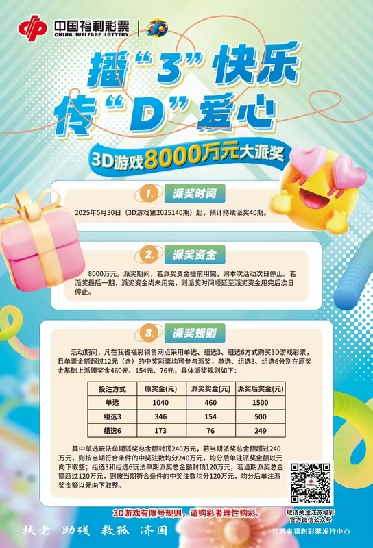 初夏已至,好運正當(dāng)時!在這草木蔥蘢、陽光漸盛的美好時節(jié),江蘇福彩3D游戲8000萬元派獎活動即將重磅來襲,為廣大彩民朋友們送上一份清新的夏日好禮。